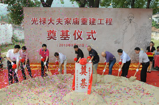9月12日,经过一年多的前期准备工作,我区光禄大夫家庙重建工程奠基仪式在炭步镇华岭村光禄大夫家庙遗址举行。区委副书记钟国雄,广州大学建筑和城市规划学院教授、岭南建筑研究所主任、古建筑专家汤国华;区委宣传部、区文化广电新闻出版局、区新闻中心、区广播电视台、炭步镇、华岭村相关负责人;骆秉章研究会、光禄大夫家庙重建工程设计单位、建设单位、骆秉章后人代表、华岭村乡亲以及新闻媒体的朋友们等共同见证了这一简单而隆重的开工仪式活动。