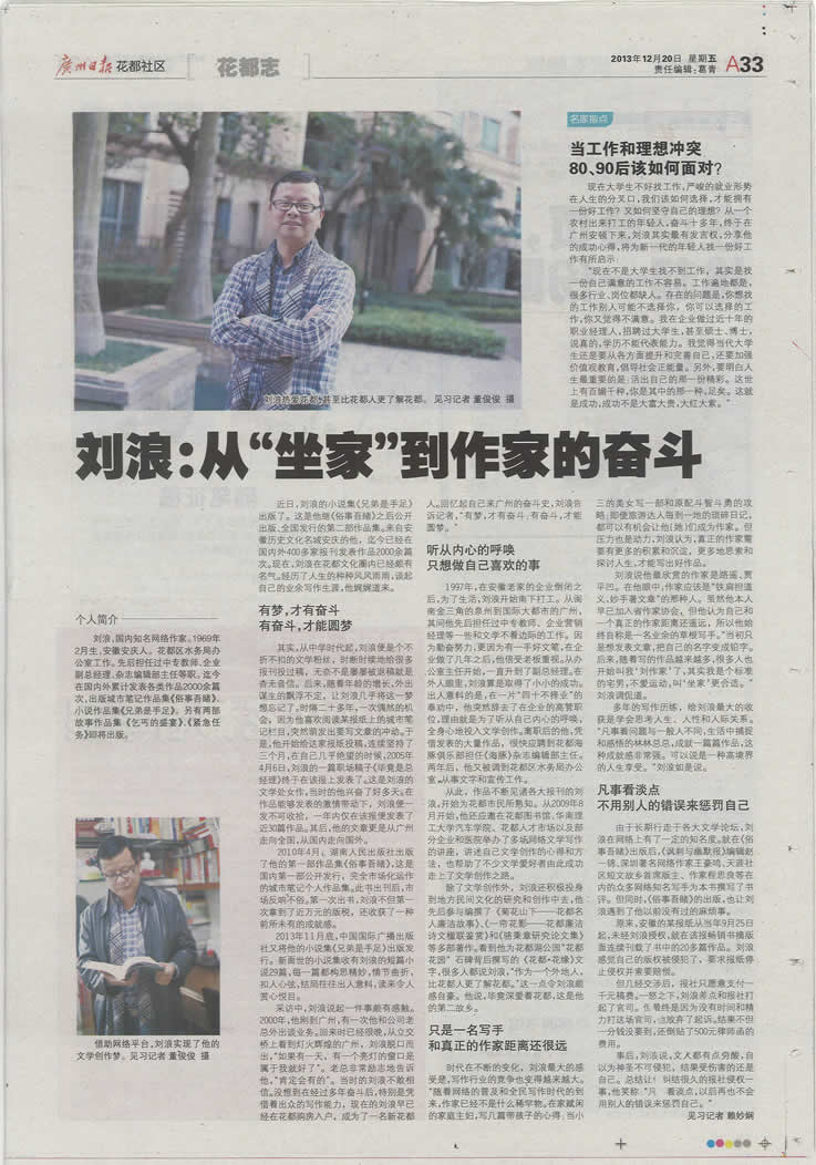 近日,刘浪的小说集《兄弟是手足》出版了。这是他继《俗事吾睹》之后公开出版、全国发行的第二部作品集。来自安徽历史文化名城安庆的他,迄今已经在国内外400多家报刊发表作品2000余篇次。现在,刘浪在花都文化圈内已经颇有名气。经历了人生的种种风风雨雨,谈起自己的业余写作生涯,他娓娓道来——