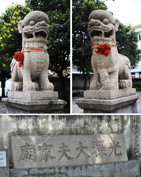 进入前三,被网友尊为“最有身份”的我区光禄大夫家庙石狮位于炭步镇华岭村光禄大夫家庙遗址。该庙为清1866年同治皇帝所赐,主人为花都乡贤,曾任湖南巡抚和四川总督的晚清一代名臣骆秉章。目前,该庙正由骆秉章后人骆鼎捐资重修。遗址前的石狮为一雄一雌,每只石狮约高1.5米,重0.9吨,造型昂首直视前方,表明家庙主人有一定身份和地位。光禄大夫家庙石狮因皇帝亲赐而显贵,更因经历多舛而传奇。1939年,家庙因隐藏国民党士兵而被日军烧毁,石狮被弃野草乱石之中。1965年,村民为保全石狮,将其埋于地下。1993年,村里建小学时将其挖出,重新立于家庙遗址门前至今。其间,有外地商人欲以25万重金购往他处,被村民们拒绝。这对石狮现已成为光禄大夫家庙历史见证的重要文物之一。